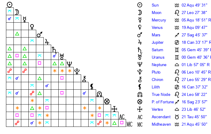 | Pluto | 6 Leo 10 | 1 Aquarius 47 | 4 Leo 55 |