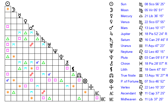 | Moon | 5 Virgo 4 | 27 Pisces 17 | 16 Virgo 24 |