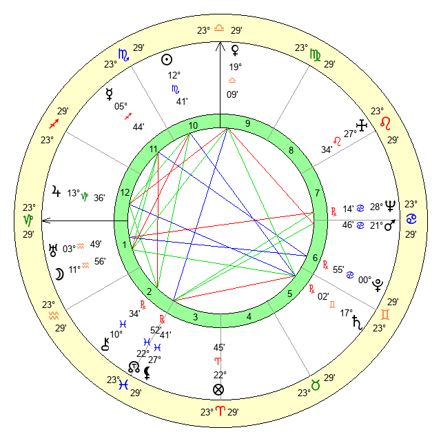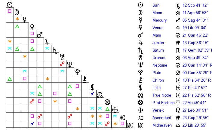 | Sun | 12 Scorpio 41 | 13 Scorpio 32 | 6 Pisces 16 |