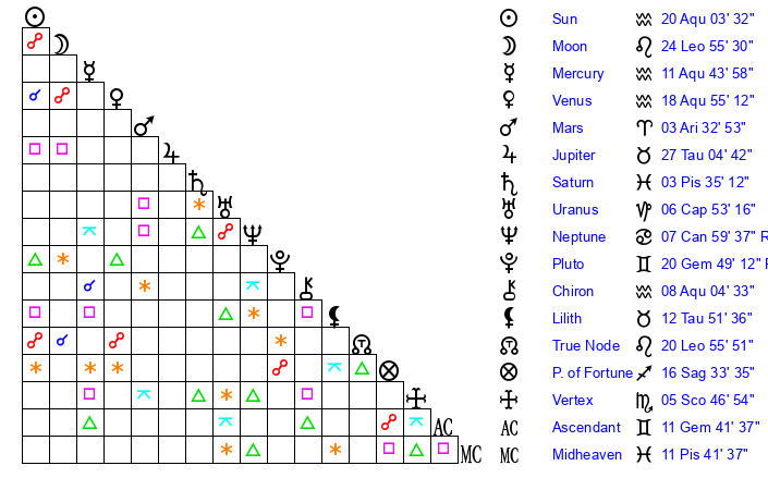 | Sun | 20 Aquarius 4 | 21 Aquarius 12 | 16 Gemini 58 |
