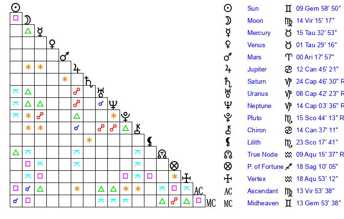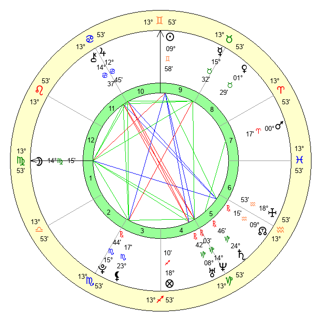 | Moon | 14 Virgo 21 | 11 Leo 44 | 17 Sagittarius 9 |
