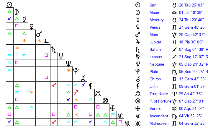 | Pluto | 5 Scorpio 19 | 3 Aquarius 45 | 4 Scorpio 36 |