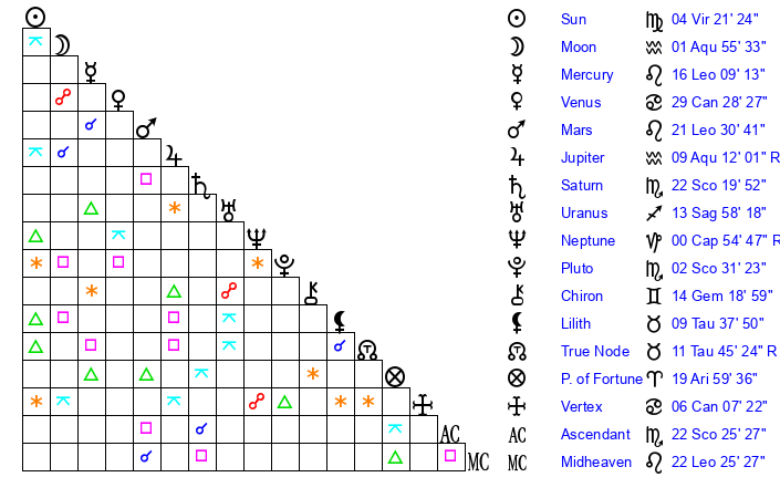 | Jupiter | 9 Aquarius 10 | 17 Cancer 6 | 7 Aquarius 7 |