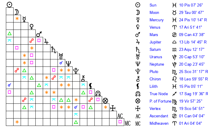 Sun | 10 Pisces 7 | 10 Pisces 21 | 11 Aries 58 |