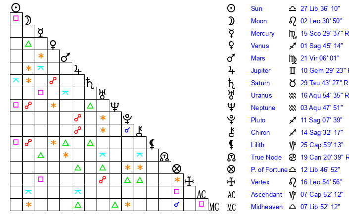 Sun | 27 Libra 37 | 27 Libra 48 | 21 Scorpio 38 |
