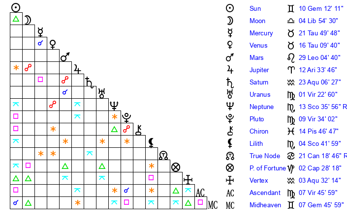 Pluto | 9 Virgo 34 | 3 Aquarius 38 | 10 Virgo 47 |