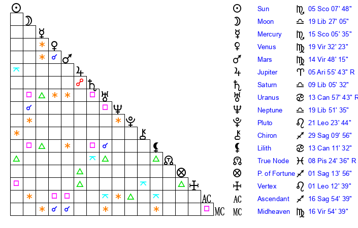 Neptune | 19 Libra 51 | 27 Pisces 32 | 21 Libra 39 |
