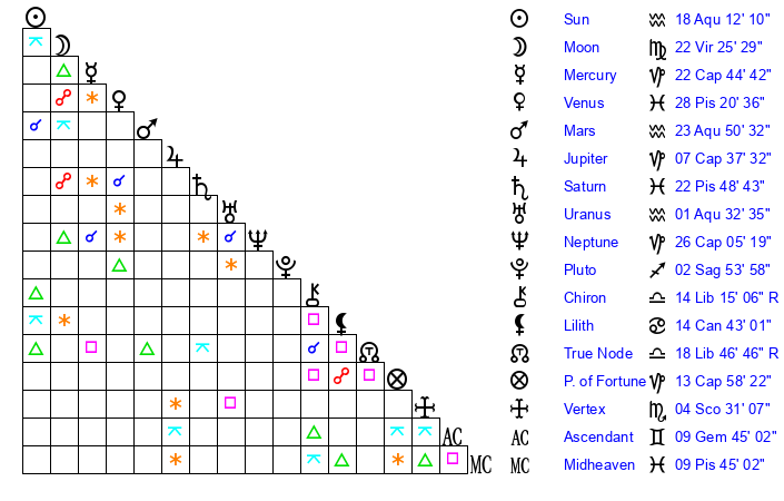 Sun | 18 Aquarius 12 | 19 Aquarius 10 | 17 Pisces 24 |