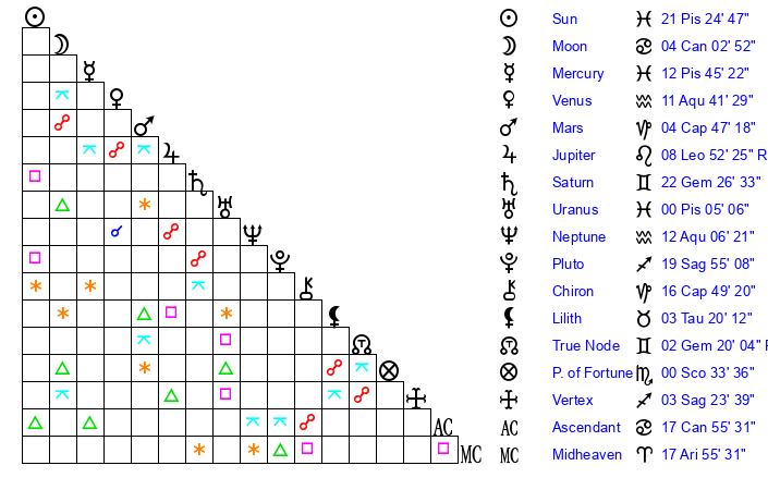 Sun | 21 Pisces 25 | 22 Pisces 5 | 13 Aries 14 |