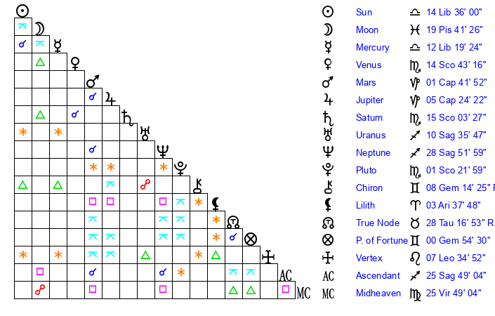 Sun | 14 Libra 36 | 14 Libra 41 | 25 Scorpio 32 |
