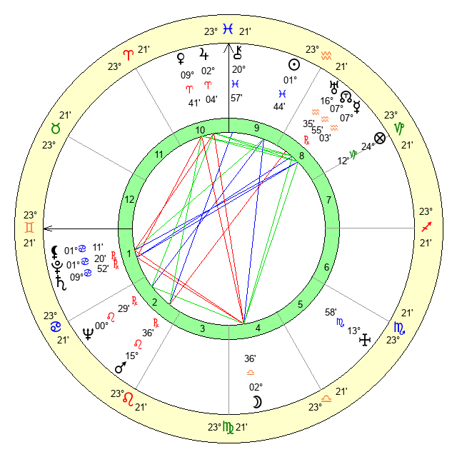 | Sun | 1 Pisces 45 | 3 Pisces 19 | 18 Gemini 29 |