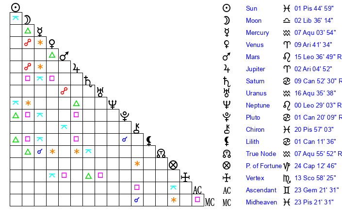 | Sun | 1 Pisces 45 | 3 Pisces 19 | 18 Gemini 29 |