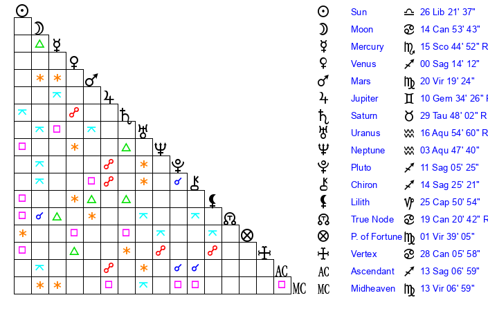 Sun | 26 Libra 22 | 26 Libra 33 | 20 Scorpio 22 |