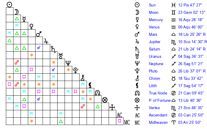 Venus | 0 Aquarius 46 | 10 Aries 47 | 9 Pisces 32 |