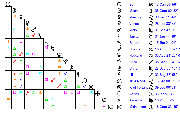 Venus | 28 Leo 39 | 6 Gemini 13 | 4 Virgo 23 |