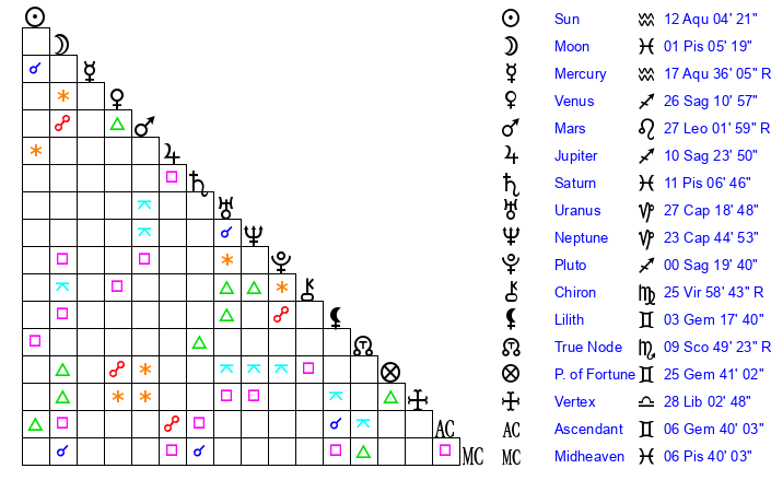Sun | 12 Aquarius 4 | 12 Aquarius 47 | 12 Pisces 21 |