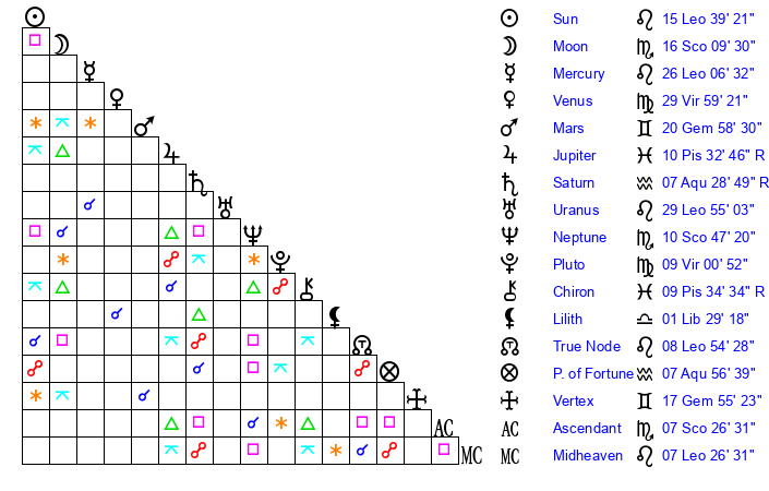 | Neptune | 10 Scorpio 46 | 1 Aries 51 | 12 Scorpio 15 |