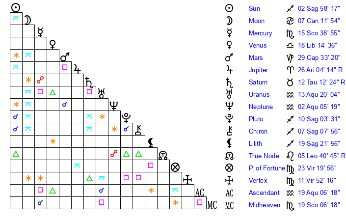 Moon | 6 Cancer 54 | 2 Libra 48 | 29 Taurus 41 |