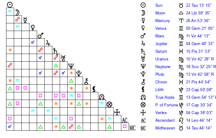 | Sun | 22 Taurus 14 | 22 Taurus 42 | 19 Cancer 38 |