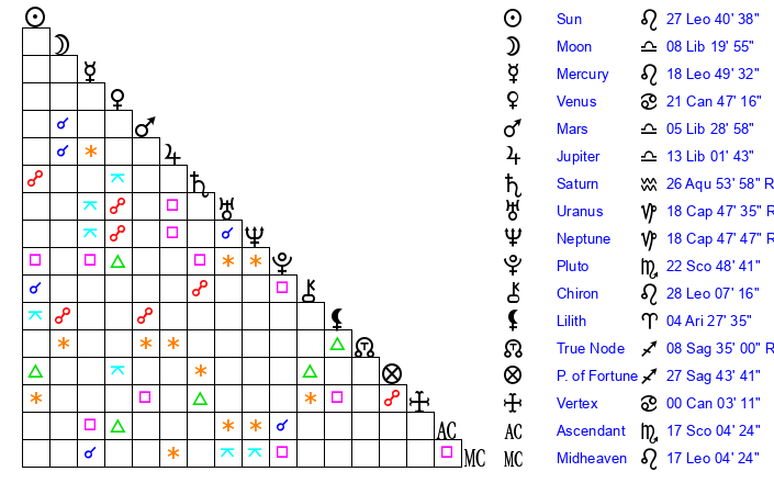 Sun | 27 Leo 40 | 27 Leo 55 | 28 Virgo 43 |