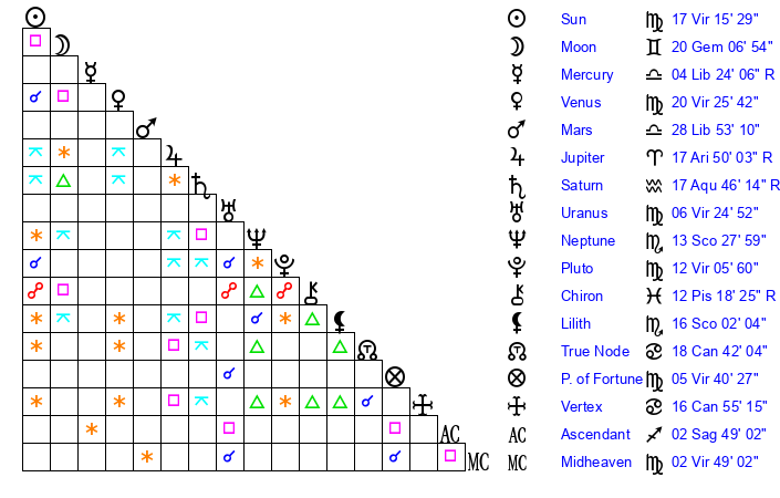 | Moon | 19 Gemini 59 | 27 Aries 58 | 28 Virgo 22 |