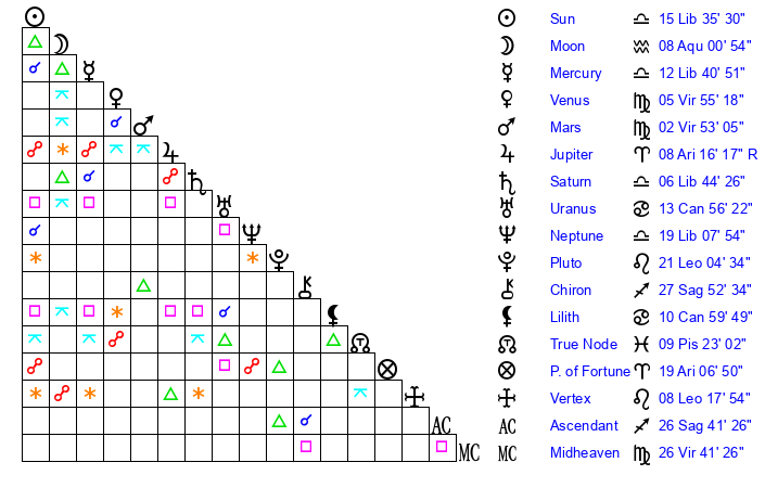 | Saturn | 7 Libra 13 | 27 Pisces 0 | 14 Libra 31 |