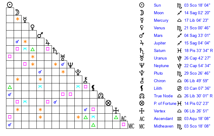 | Sun | 3 Scorpio 18 | 4 Scorpio 2 | 3 Sagittarius 27 |