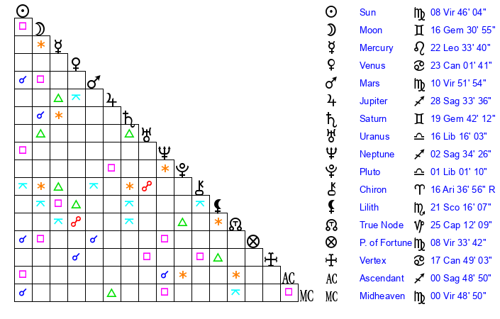 Moon | 16 Gemini 23 | 18 Sagittarius 24 | 22 Taurus 46 |