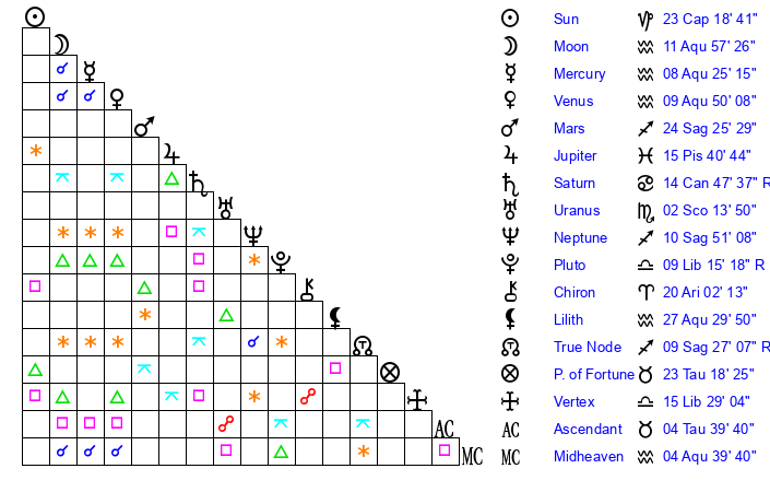 Moon | 11 Aquarius 55 | 26 Cancer 31 | 17 Sagittarius 6 |