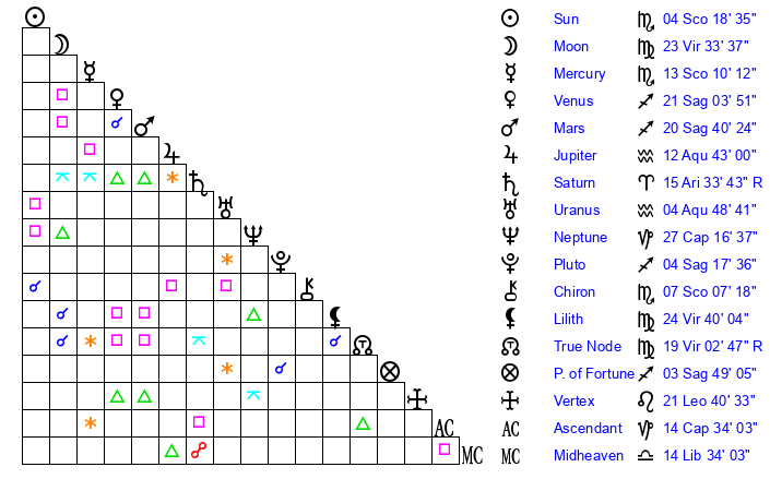 Moon | 23 Virgo 36 | 12 Virgo 34 | 19 Virgo 57 |
