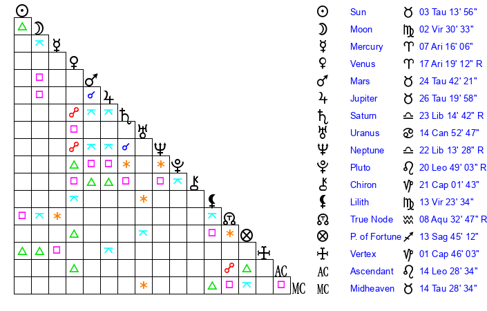 | Moon | 2 Virgo 27 | 6 Pisces 54 | 22 Aries 43 |