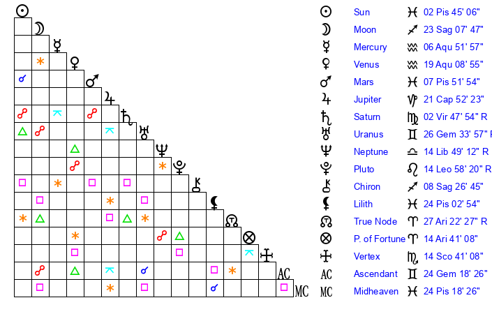 | Neptune | 14 Libra 48 | 28 Pisces 38 | 12 Libra 55 |