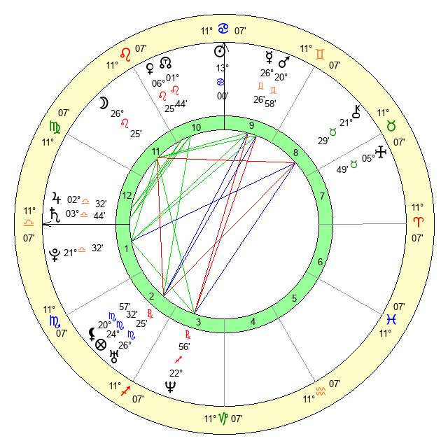 | Jupiter | 2 Libra 24 | 5 Cancer 46 | 8 Libra 54 |