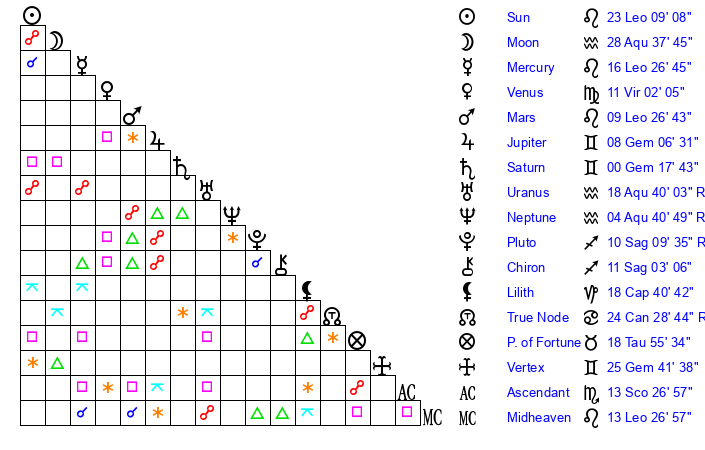 Moon | 28 Aquarius 44 | 16 Taurus 15 | 1 Aquarius 12 |