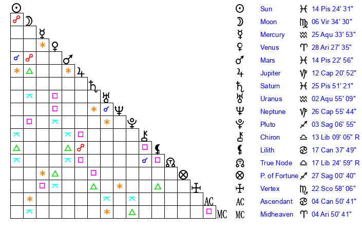 Mercury | 25 Aquarius 34 | 1 Aries 54 | 18 Aries 58 |