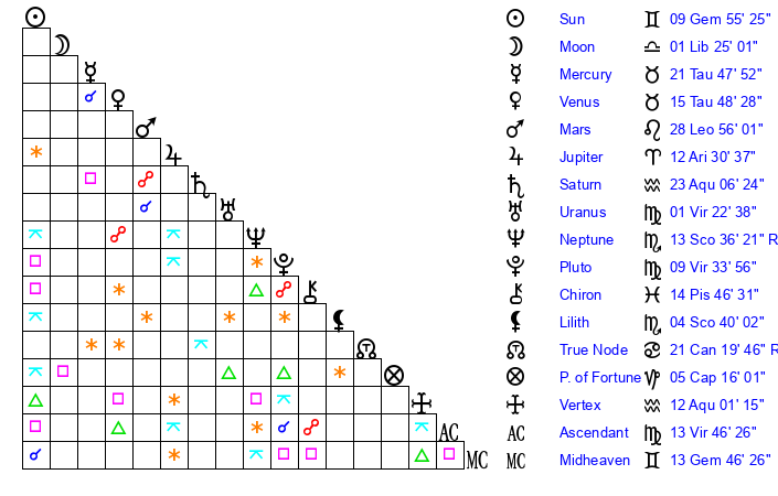 Mercury | 21 Taurus 47 | 13 Gemini 19 | 27 Leo 55 |