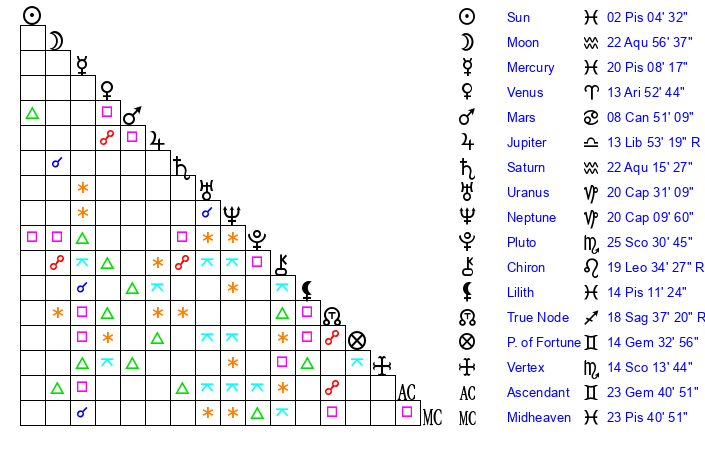 Sun | 2 Pisces 4 | 2 Pisces 18 | 4 Aries 4 |