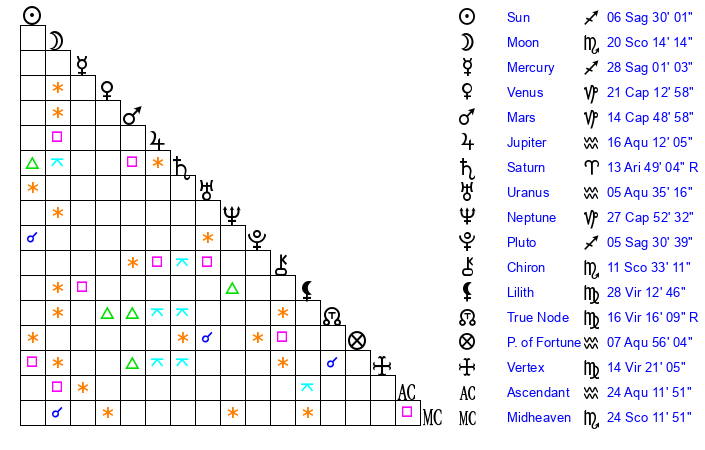 Pluto | 5 Sagittarius 30 | 0 Aquarius 10 | 6 Sagittarius 32 |
