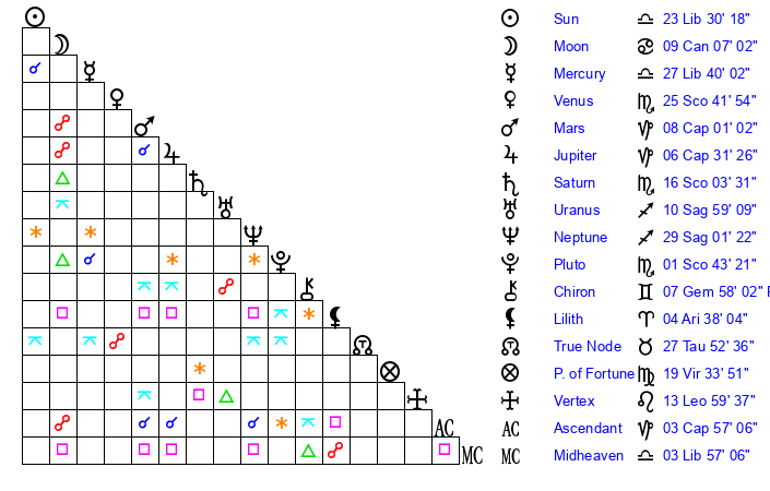 Moon | 9 Cancer 1 | 12 Aries 53 | 9 Capricorn 32 |