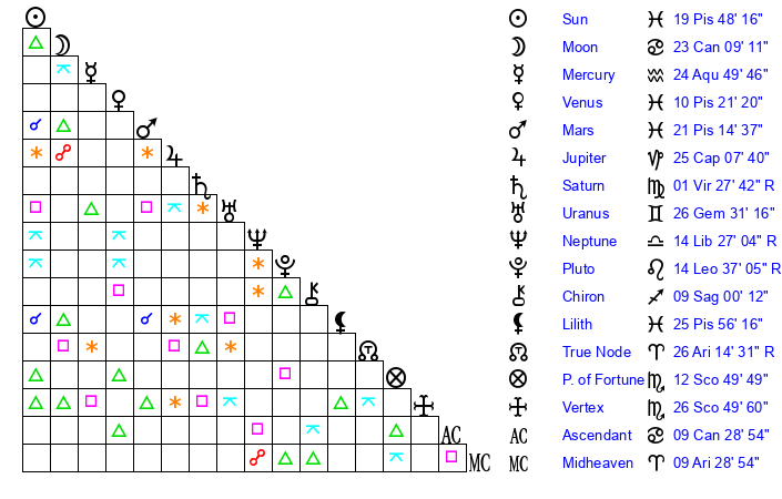 | Neptune | 14 Libra 26 | 29 Pisces 15 | 12 Libra 36 |