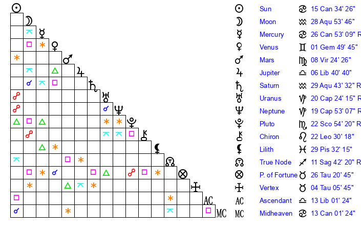 Mercury | 26 Cancer 53 | 11 Leo 25 | 27 Cancer 48 |
