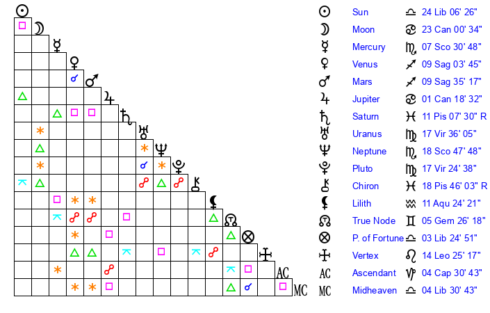 | Uranus | 17 Virgo 40 | 0 Gemini 47 | 19 Virgo 40 |