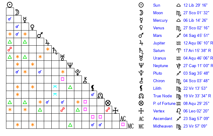 Moon | 27 Scorpio 5 | 22 Pisces 50 | 6 Sagittarius 41 |
