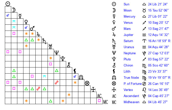 Sun | 24 Libra 22 | 24 Libra 49 | 21 Scorpio 21 |