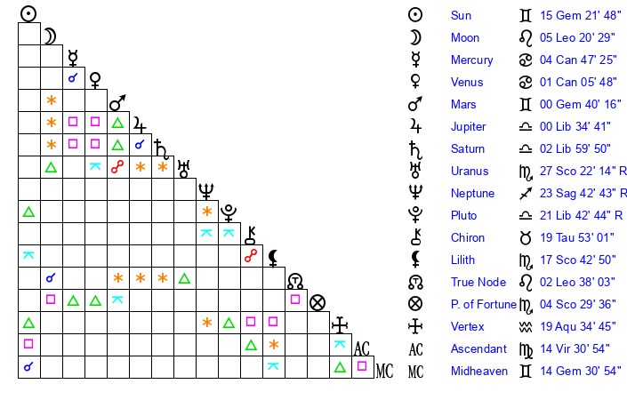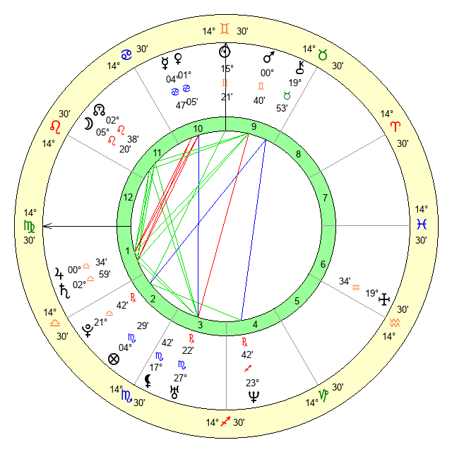 | Jupiter | 0 Libra 25 | 29 Gemini 10 | 4 Libra 14 |