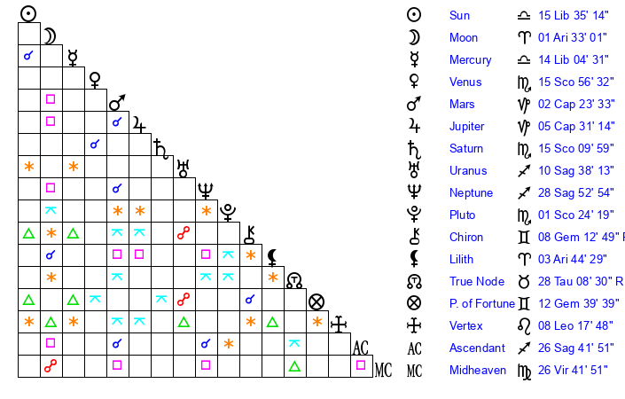 Sun | 15 Libra 36 | 15 Libra 40 | 26 Scorpio 33 |