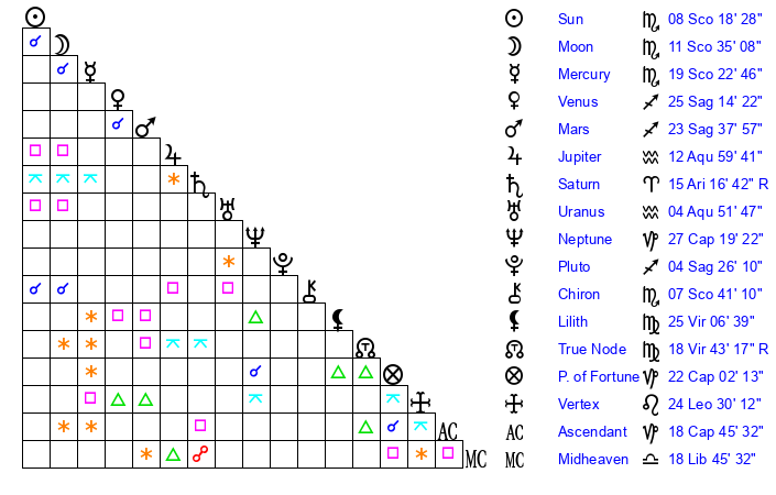Moon | 11 Scorpio 41 | 29 Libra 49 | 7 Scorpio 48 |