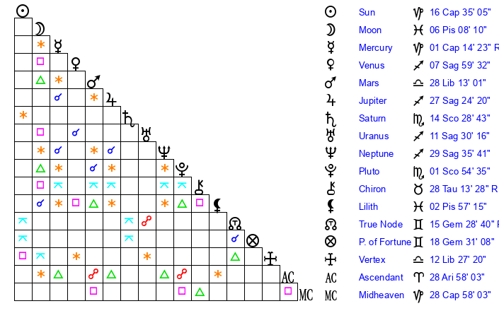 | Neptune | 29 Sagittarius 36 | 27 Pisces 24 | 0 Capricorn 53 |