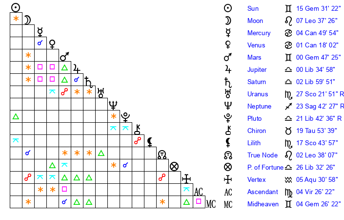 Sun | 15 Gemini 32 | 15 Gemini 53 | 27 Cancer 31 |
