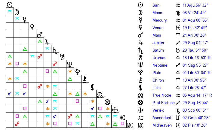 | Sun | 11 Aquarius 56 | 13 Aquarius 5 | 5 Aries 8 |